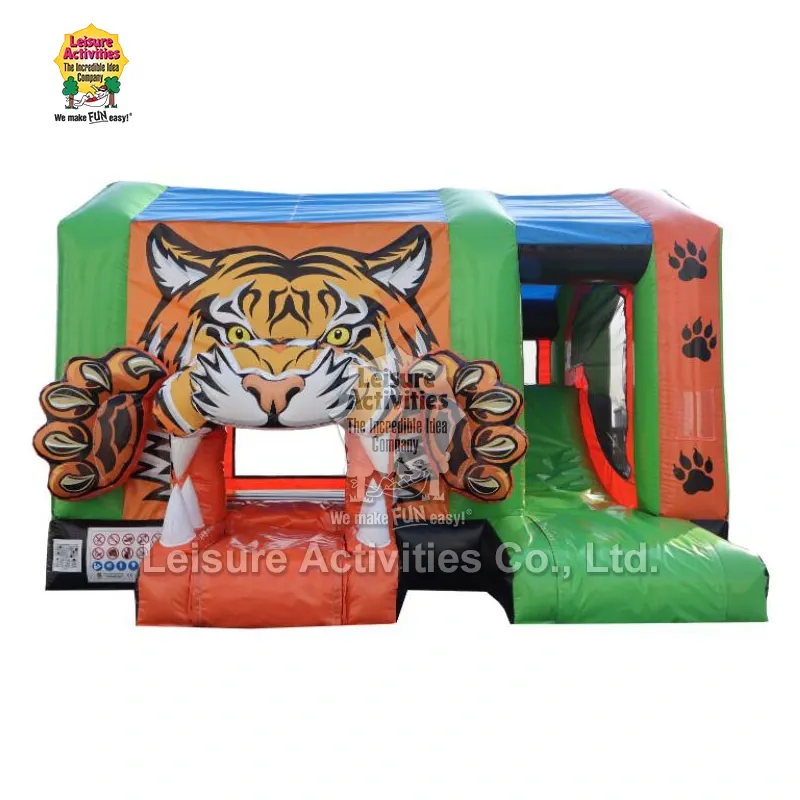 Leisure Activities® is a professional manufacturer and supplier of inflatable products in China. Standard Inflatable Multiplay Tiger Bouncy Castles is a tiger-themed inflatable castle that combines jumping, climbing and sliding features. It features lime green and orange as the main colors, with a 3D tiger decoration at the entrance. It can be quickly set up in just 10 minutes.